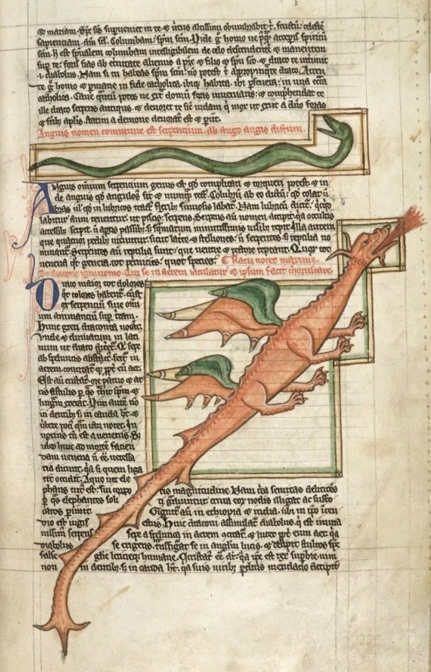 You can see the influence of draconic traits from the Bible in the MS Harley dragon as well as other artistic depictions of dragons during the period. In Christianity, dragons were used to show the power of God overcoming evil. A physical manifestation of evil aided the church’s ethos to convince citizens of the reality of God’s word. In rhetoric, ethos is when you make “appeals to audience values and authorial credibility/character” (Gagich).