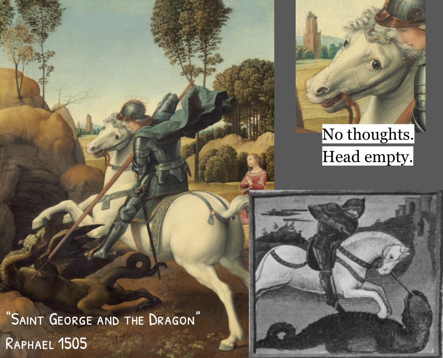 People and/or dragons who are facing each other face to face are generally implied to be antagonistic towards each other. However, the way I drew the dragons in Western Dragons Across Time doesn’t make their motivations entirely clear. There is definitely an interaction going on here, and while the Medieval Dragon looks like it means business with its fire-breathing and human skeleton hanging out of its mouth, the smaller Modern Dragon looks like it wants to play! The dragon rider’s obscured face hides any hint of motivation or attitude, thus leaving it to the audience’s interpretation.