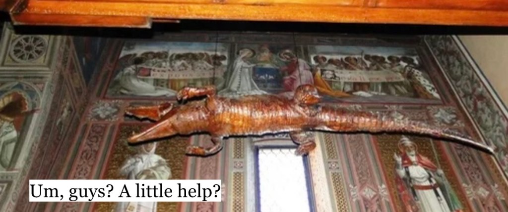 On top of that, many Europeans had never seen a crocodile on account of there being no Internet or crocodiles in medieval Europe. So when they saw the largest, scaliest, toothiest reptile they had ever seen in their entire lives, it’s understandable that they mistook the familiar U.S. Florida Gators mascot for evil incarnate. Sometimes, they would slay the beast, and take it back to the local church to display God’s victory in all its glory. Imagine sitting in the pew on Sunday and looking up at the dried-up carcass of ol’ Smiley chained up to the rafters as the choir sings.