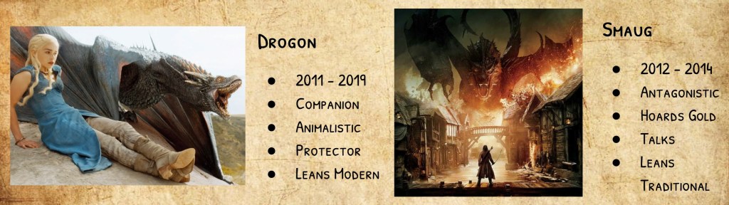 Western dragons are a perfect representation of fantasy as they are purely a product of the human imagination. Medieval dragons were grounded primarily in the Bible and regarded as antagonistic. Belief in them faded when imagination didn’t match reality, but fascination remained in the idea of fantastic, dangerous creatures. Dragons were then used to represent the ethos of people groups (company or country) and found a place in the fantasy genre in literature and visual mediums (especially when fantasy was obsessed with the medieval period… and still is in some ways). While dragons can still be portrayed as an antagonistic force today, they have been influenced by people anthropomorphizing dragons. Gradual experimentation and diversification of use has led to a broad range of interpretation. As much as they have changed, we still seek to make dragons that feel real.