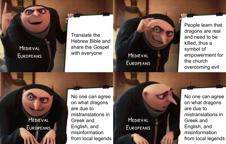 - Dragons are mentioned frequently in Latin and vernacular Bibles, thanks to mistranslations of one Hebrew term signifying water monsters and another referring to a desert mammal now believed to be a jackal. Both creatures were rolled into one Latin term, Draco, which caused confusion and gave the dragon some contradictory characteristics” (Lippincott).