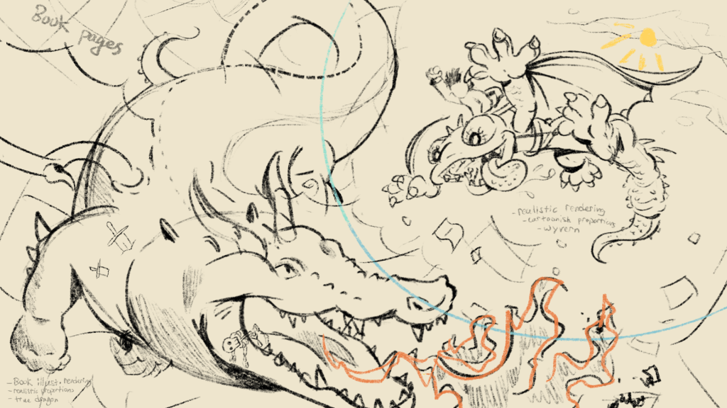 The dualism present in narrative roles and time is also present in the art style. The left side of the artwork is the past – the Medieval Dragon. The right side is the present – the Modern Dragon. The left side looks older and illustrative and the right is brighter and more realistic. The backgrounds represent the opposition through an old paper-like texture and open sky. Interestingly, the Medieval Dragon is burning the sky. I didn’t have any symbolism in mind when I drew that. I just thought it would look cool. It could be interpreted as the Medieval Dragon being the antagonist. For the Medieval Dragon’s style, I drew heavy inspiration from the earliest known picture of a dragon: MS Harley 3244. I noticed how the highlights were made from leaving negative space for the light page color to shine through, and the shading was made from darkening the red pigment. So, of course, the Medieval Dragon is red to call back to that classic red idea for a dragon that is also referenced Biblically. Instead of a little goatee, as is the usual staple for medieval dragons, I gave the Medieval Dragon hair on the side of the face (sideburns?) since the lower jaw was cut off by the end of the frame. I made parts of the Medieval Dragon go out of frame in order to emphasize the scale and intimidation, as if it is too big to fit into this picture. I wanted to include a reference to the “not-dragon” crocodiles found in some European churches. The body and head is based on the Nile crocodile since that was a type of crocodile in one of the churches. It has curved horns on its head, elbows, and wings to reference the slight curving horns in the MS Harley 3244. The didactic nature of dragons as an evil or opposing force in a narrative of good versus evil is represented by the Medieval Dragon due to its scale, threatening features, and deadly actions as seen through the skeleton and fire.